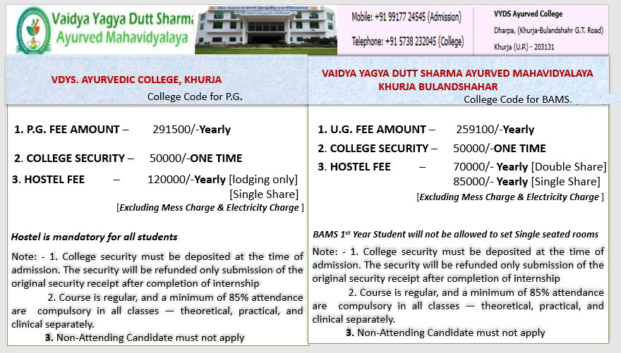 उ0प्र0 शासन ने अपने 4816/96-आयुष-1-2020-95/2010 दिनाॅक 24 दिसम्बर, 2020 के द्वारा महाविद्यालय में संचालित पाठ्यक्रमों के शुल्क का निर्धारण निम्न प्रकार किया है-