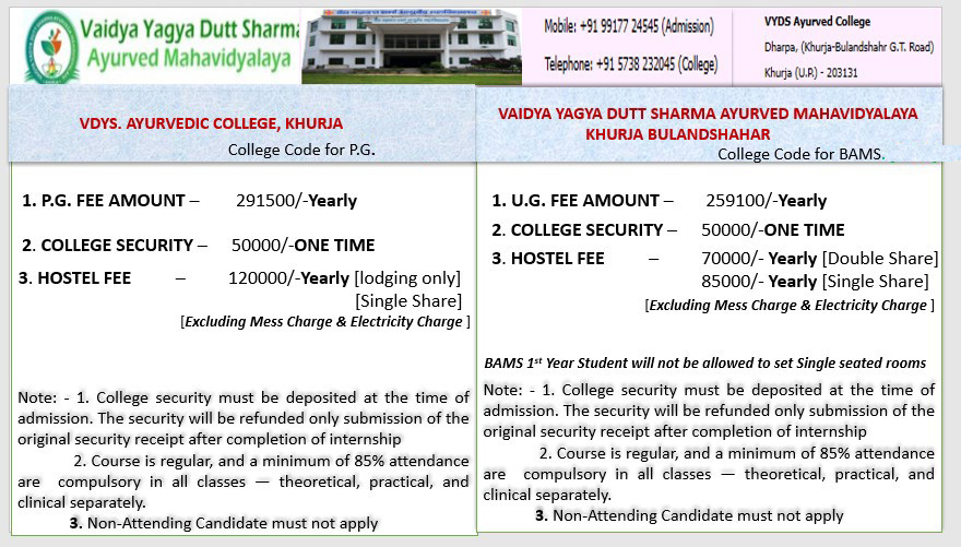 उ0प्र0 शासन ने अपने 4816/96-आयुष-1-2020-95/2010 दिनाॅक 24 दिसम्बर, 2020 के द्वारा महाविद्यालय में संचालित पाठ्यक्रमों के शुल्क का निर्धारण निम्न प्रकार किया है-